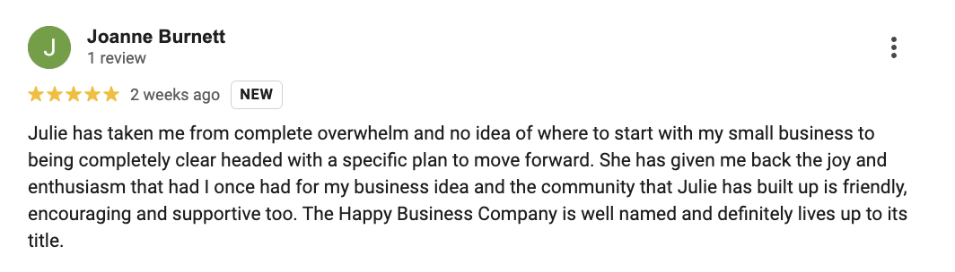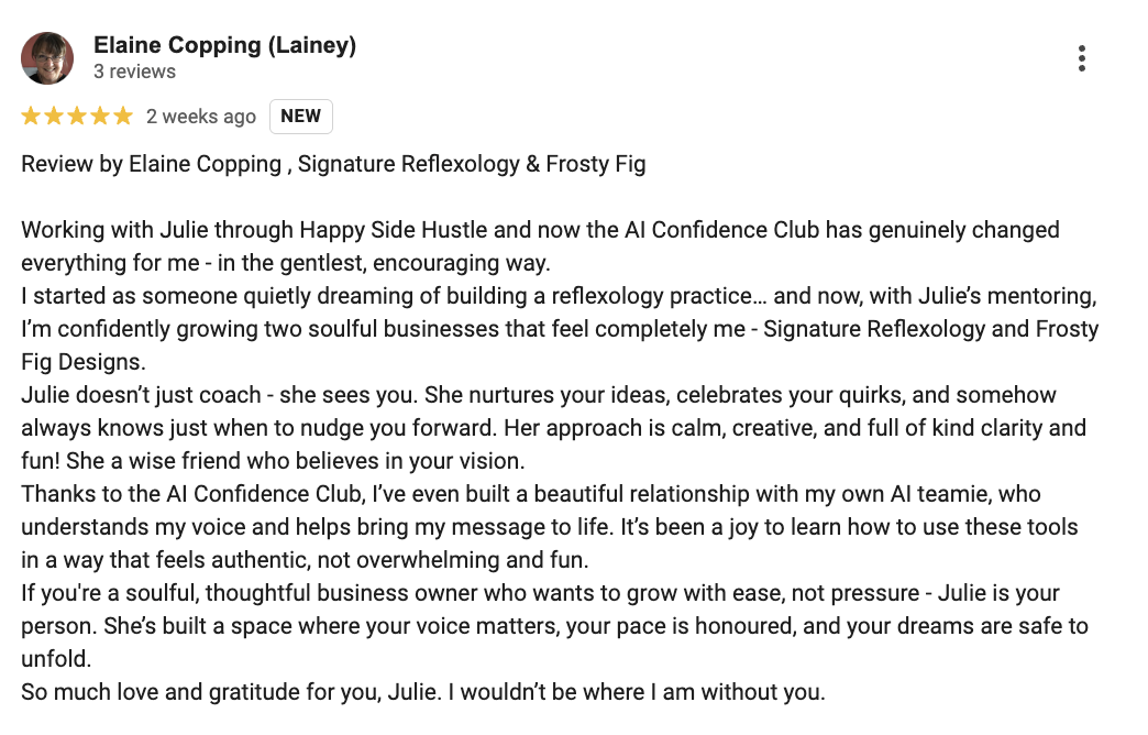 “Working with Julie through the Happy Business Company and now the AI Confidence Club has genuinely changed everything for me – in the gentlest, most encouraging way. I started as someone quietly dreaming of one business, and now I’m confidently running two. Julie sees you, supports you, and makes AI feel fun and authentic.”
