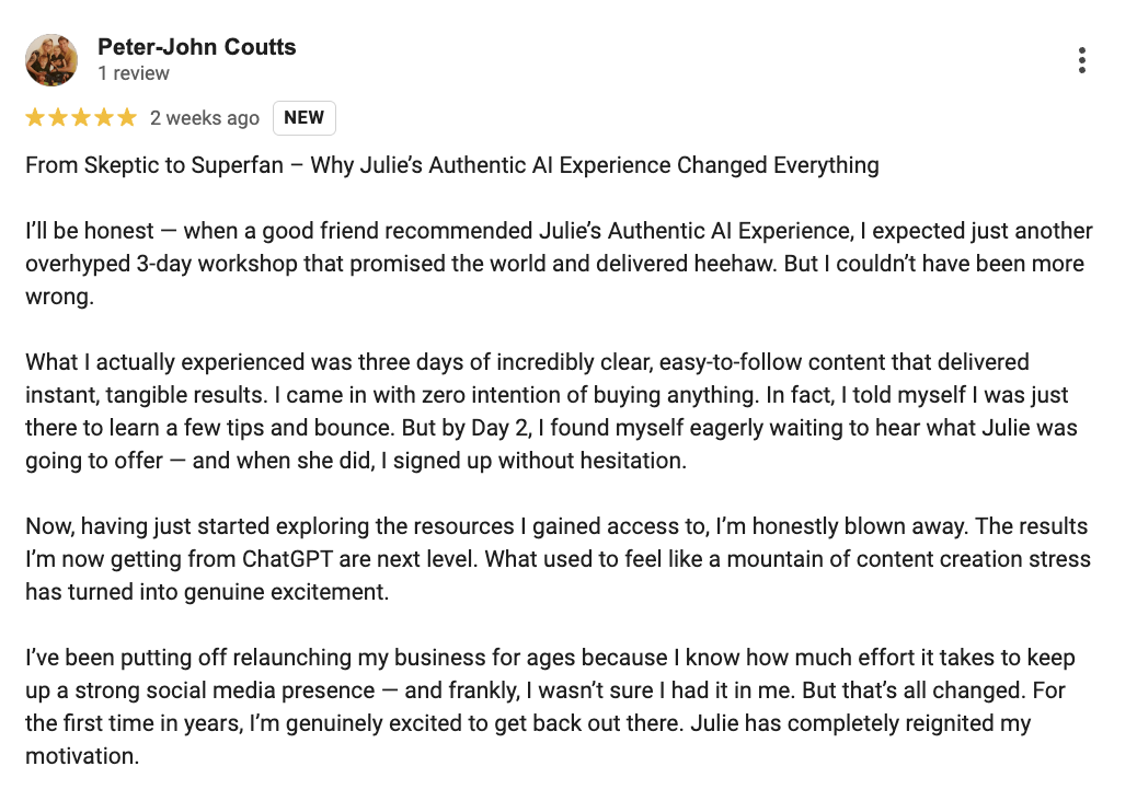 And these are just a few. From complete novices to business owners who had tried AI before, the results are the same: clarity, relief, and the confidence to finally show up consistently.