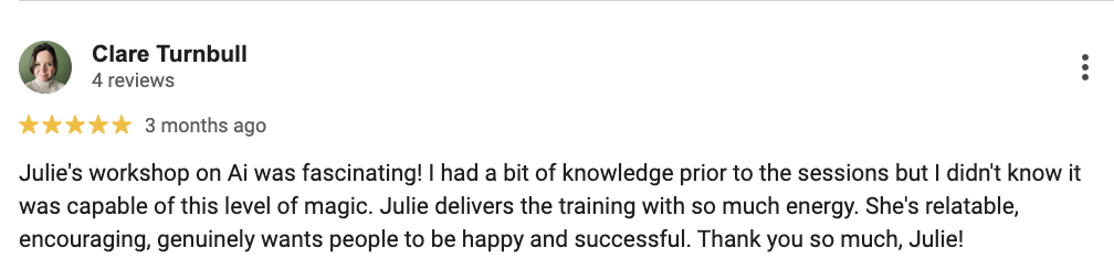 “I feel so empowered to use ChatGPT for my small business. Julie is absolutely brilliant!”